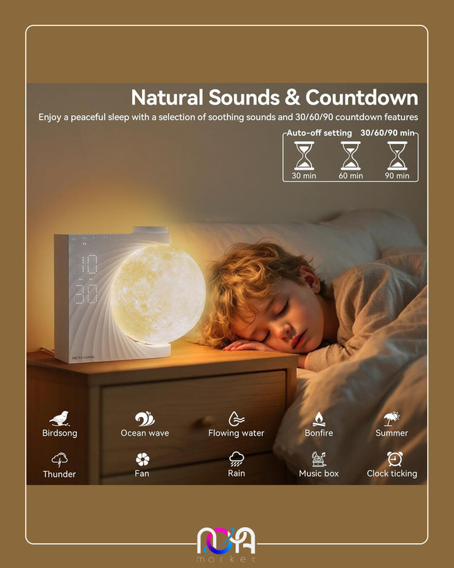 این محصول دارای آپشن های خاصی برای تایم شب و بیدار شدن صبح داره، به عنوان مثال شما میتوانید با استفاده از آپشن چرت زدن، 10 دقیقه زمان بیشتری برای لذت بردن از خواب ببرید و بعد با صدای آرامش بخشی از خواب بیدار شوید یا حتی با غیرفعال کردن صدا، دستگاه نور خود را از 0% تا 100% به تدریج افزایش میدهد تا از طریق روشنایی نور ماه بیدار شوید!