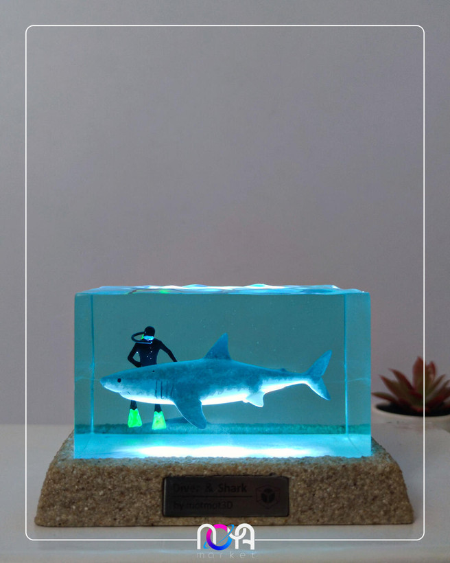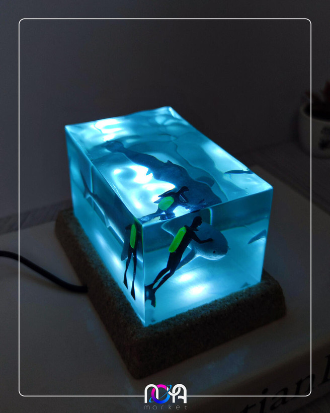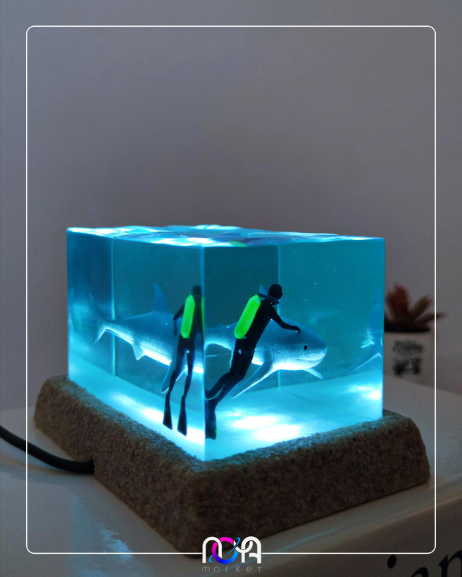 🦈جنس کار از رزینه و دارای کلید پاور لمسیه، با برق کار میکنه و ابعادش حدود ۱۳×۹×۸ سانتیمتره. (انتهای کابل usb میباشد و میتونید از طریق شارژر گوشی، پاوربانک، لپتاپ و ... روشنش کنید)