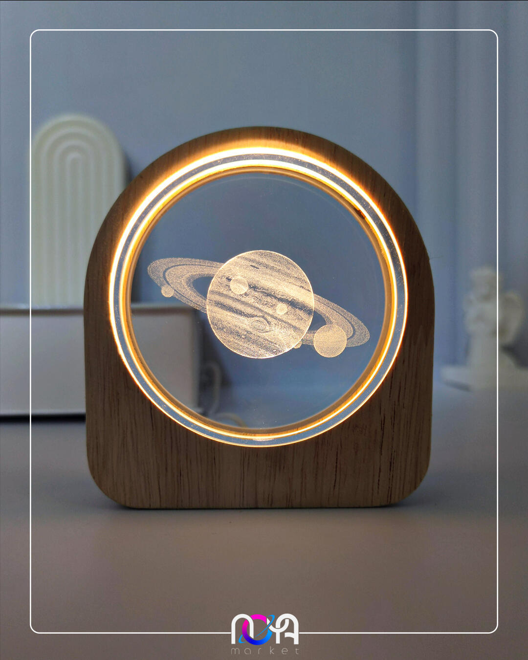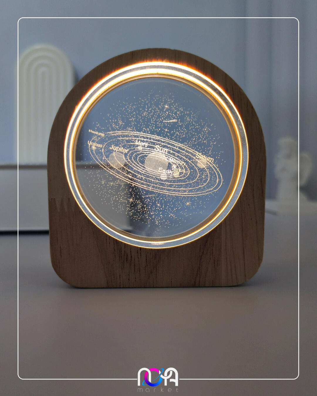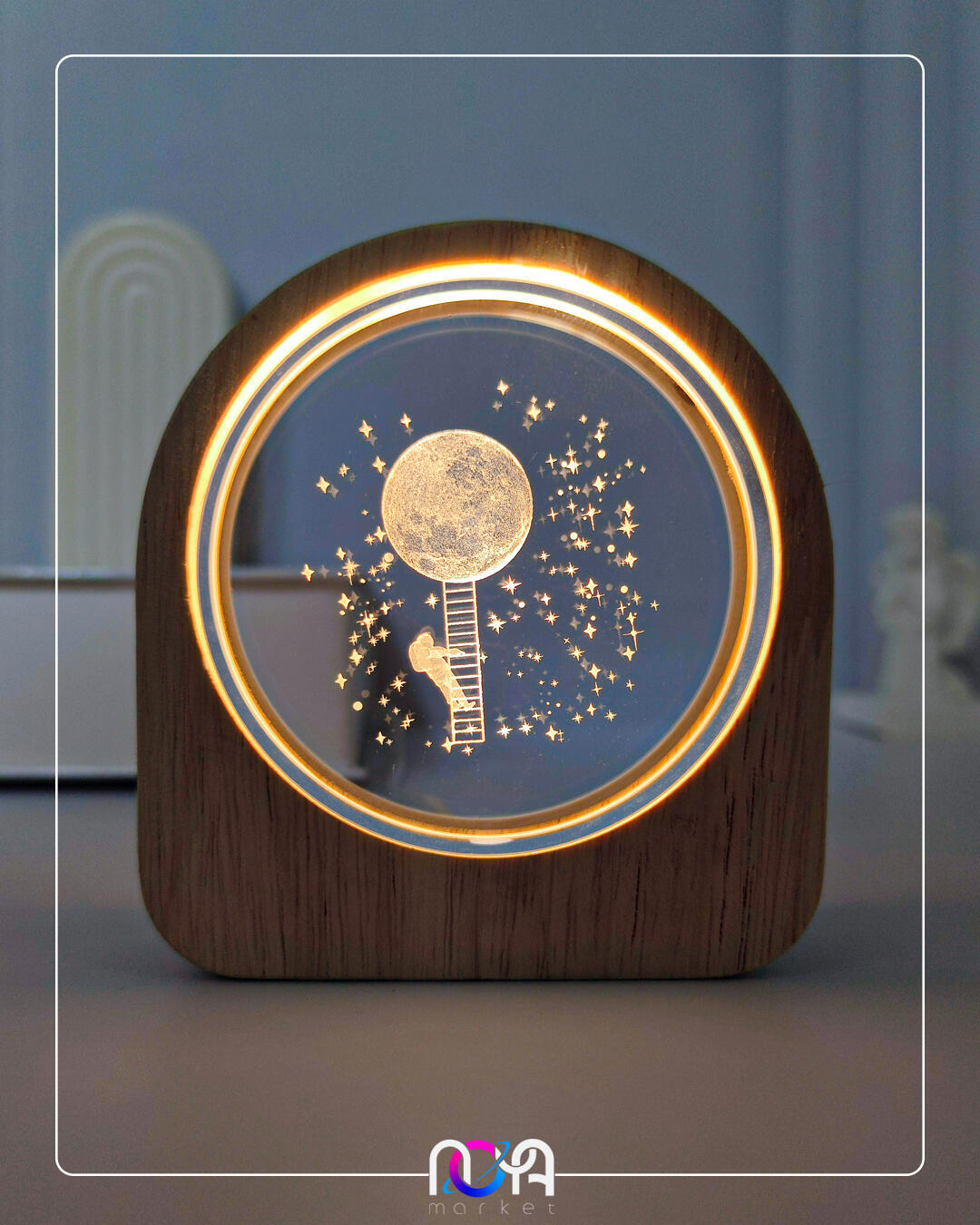 🔮چراغ قاب چوبی، شامل یک فریم چوبی جذاب و شیشهی تخت و دایرهشکل داخلش هست که نور از داخل فریم چوبی، وارد کریستال میشه✨